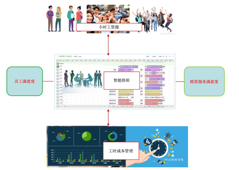 • 基于管理提升和多种用工形式(全职、非全、外包)综合运用的灵活用工解决方案。这个方案的核心是:1)通过精益排班在平衡顾客满意度和员工满意度的前提下识别出餐厅真实的用工需求实现最优 2)通过打通内推、外部招聘网站及外包公司的连接来及时获得大量的劳动力资源,从而从管理上提升和在资源获取上取得突破实现真正的灵活用工。在大量的服务机构中,超级班表凭借过硬的产品能力和服务方案获得了大量的餐厅的青睐在这个领域处于领先地位。超级班表在底层逻辑上实现了将门店目前的编制优化为基于客流拉动的劳动力供给,结合最新的人力资源管理实践,将餐厅岗位技能化,员工编制工时化,在门店采用一套包括缩写、颜色、线条等组成的科学表达方式实现工时规划和排班发布,并在门店现场管理中持续监控和及时调整,从而获得最佳的餐厅劳动力配置方案进而结合多种用工形式,帮助餐厅实现了真正的成本和服务水平的控制与平衡。