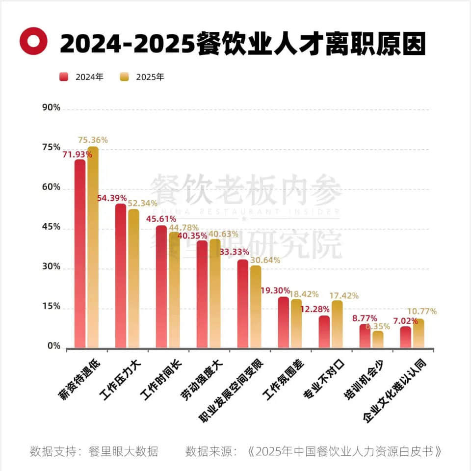 此外,让餐饮品牌头疼的还有人员的高流动性。据《2025年中国餐饮业人力资源白皮书》,2024年一线服务员年离职率高达89.47%,后厨一线人员75.44%,而高层管理人才仅3.5%。