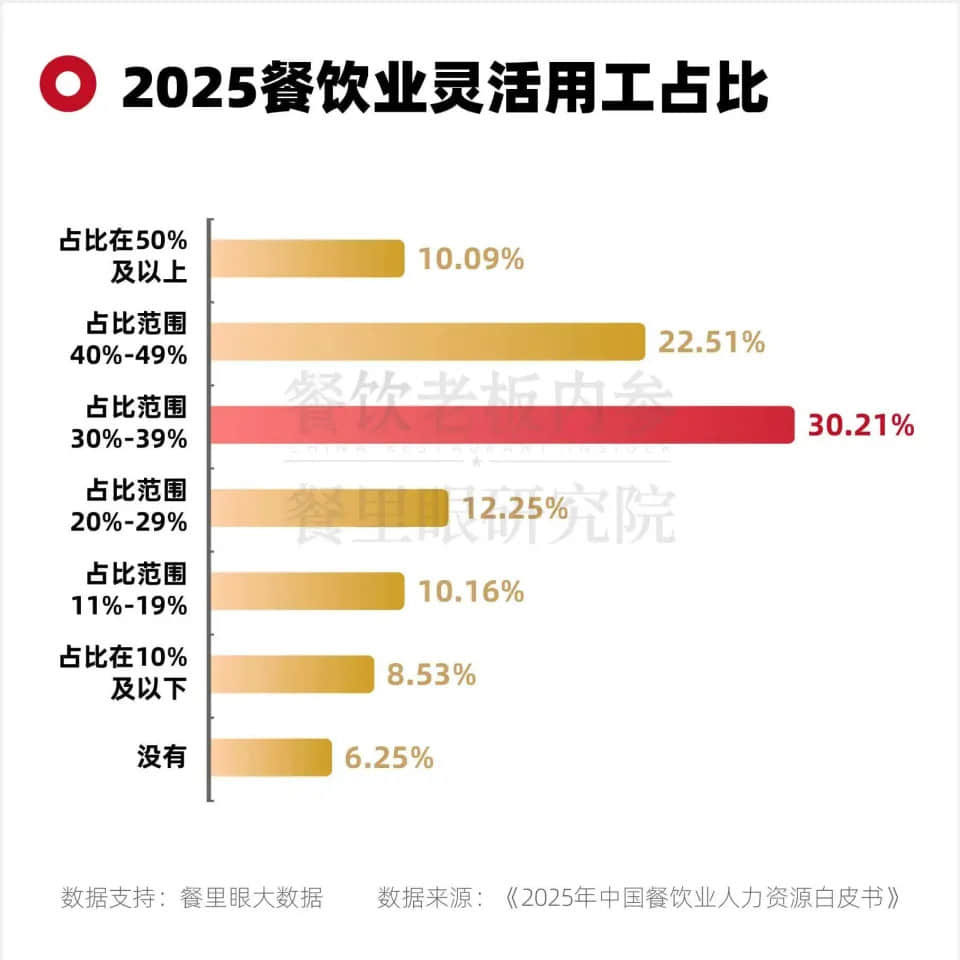 根据最新行业调研数据,2025年餐饮行业中灵活用工占比最高的区间为30%-39%,显示出该用工模式已在业内形成主流趋势。